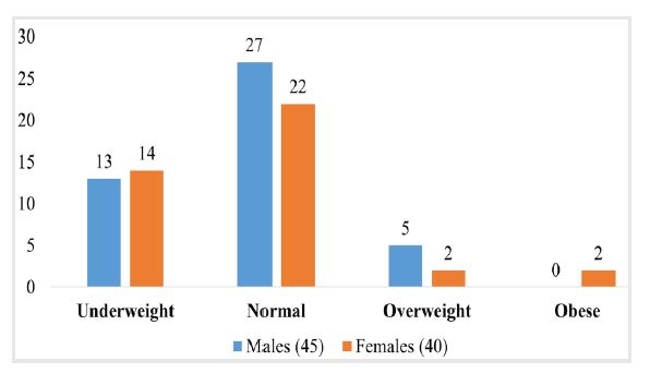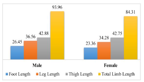 Males demonstrated consistently larger limb measurements, including foot length, leg length, thigh length, and total limb length, compared to females (Figure 1). BMI categories indicate that most individuals fall within the “normal” range, with minimal cases of obesity or underweight status among both males and females (Figure 2).